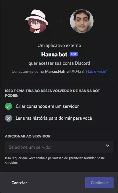 Adicione a Hanna ao seu DiscordAo clicar no botão para adicioná-la, uma interface do Discord será aberta. Lá, será solicitado que você escolha o servidor que irá receber o bot (cuidado para não escolher o errado!).